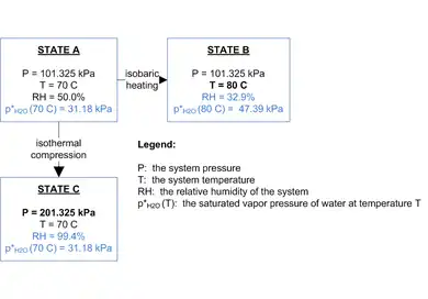 If the system at State A is isothermally compressed (compressed with no change in system temperature), then the relative humidity of the system increases because the partial pressure of water in the system increases with the volume reduction. This is shown in State C. Above 202.64 kPa, the RH would exceed 100% and water may begin to condense.