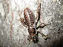 Hump-winged grigs are known for their unique mating habits.[2] Males call at night by sitting on a tree trunk with their head down and emitting a short, high-pitched trill.[1] When a female mounts the male, the male uses two hooks on its back to hold onto the underside of the female's abdomen while transferring spermatophore.[2] During copulation, the female eats the male's hind wings and drinks the male's blood for energy,[3] causing permanent but nonfatal damage to the male.[2] Hungry females are more likely to mate, will mount males sooner, and are less selective when choosing mating partners.[2][3] "Virgin" males, with no hind wing damage, are generally more successful at mating than non-virgin males.[2]
