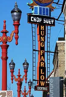 The restaurant erected a large advertisement, which became known as the "Hung Far Low sign" (or the "Chop Suey Hung Far Low Cocktails" sign, based on its displayed text),[1] as early as 1928.[2][10] The two-story, 2,000-pound (910 kg) sign and its supports were severely damaged by the 2000s.[5] In 2008, the display was removed during building renovations and for safety reasons,[15] and put into storage at a sign repository in Scappoose, Oregon.[1][2][10] Local residents organized a campaign to save the advertisement, and Kurt Huffman and Andy Ricker, the restaurateurs who opened Ping when Hung Far Low relocated,[10] worked to keep the sign because of its popularity.[5]