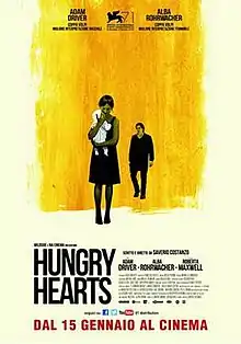 Hungry Hearts is a 2014 Italian drama film directed by Saverio Costanzo. It was selected to compete for the Golden Lion at the 71st Venice International Film Festival.[2][3] At Venice, Adam Driver and Alba Rohrwacher won the Volpi Cup for Best Actor and Best Actress respectively.[4] It was also screened in the Special Presentations section of the 2014 Toronto International Film Festival.[5]