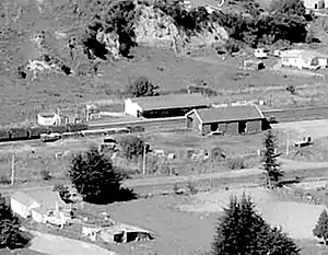 Goods were first carried to the station on 19 October 1887,[3] though the official opening of the 15 mi 57 ch (25.3 km) Marton to Hunterville section was not until Saturday 2 June 1888, when the station was served by two trains a week,[4] reported as losing £15 a week.[5] A Certificate of Inspection for the line was issued on Wednesday, 6 June 1888.[4] Hunterville closed on 13 October 1986, though the passing loop was retained.[6] A platform also remains.[7]