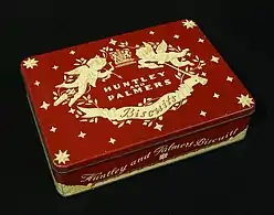 Huntley & Palmers is a British company of biscuit makers originally based in Reading, Berkshire.[1] Formed by Joseph Huntley in 1822, the company became one of the world's first global brands (chiefly led by George Palmer who joined in 1841) and ran what was once the world’s largest biscuit factory.[2][3] The biscuits were sold in elaborately decorated biscuit tins. In 1900, the company's products were sold in 172 countries; further, their global reach saw their advertising posters feature scenes from around the world.[4] Over the years, the company was also known as "J. Huntley & Son" and "Huntley & Palmer".