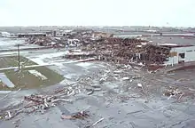 Despite concerns that Texas might suffer a direct hit, there was only minor damage reported in southern Texas from Gilbert's landfall 60 miles (97 km) to the south. Winds gusted to hurricane force in a few places, but the main impact felt in the state was from beach erosion caused by a 3-5-foot storm surge, and tornadoes, which mainly affected the San Antonio area. 29 tornadoes were spawned by Gilbert in Texas, at least two of which were killer tornadoes. Estimates ranged from 30 to more than 60 hitting 25 Texas counties. Nine of them hit San Antonio, where a 59-year-old woman was killed as she slept in her mobile home. 40 tornadoes were spawned in an area from Corpus Christi and Brownsville north to San Antonio and west to Del Rio.[44][45] Gilbert also provided a good look at a particular unusual hurricane-spawned tornado in Del Rio, two hundred and fifty miles from the ocean. It was the first of this type of tornado to be captured on film since a tornado spun from Hurricane Agnes in 1972. Despite the massive appearance of the tornado, it did not produce a wide range damage path. Few hurricane-spawned tornadoes do. In the state, a major disaster was declared on October 5, 1988.[46]