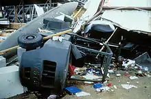 Hurricane Gilbert produced a 19 ft (5.8 m) storm surge and brought up to 823 millimetres (32.4 in) of rain in the mountainous areas of Jamaica,[25] causing inland flash flooding. 49 people died.[20] Prime Minister Edward Seaga stated that the hardest hit areas near where Gilbert made landfall looked "like Hiroshima after the atom bomb."[26] The storm left $700 million (1988 USD) in damage from destroyed crops, buildings, houses, roads, and small aircraft.[27] Two people eventually had to be rescued because of mudslides triggered by Gilbert and were sent to the hospital. The two people were reported to be fine. No planes were going in and out of Kingston, and telephone lines were jammed from Jamaica to Florida.[9]