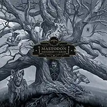 Album artwork by Paul Romano, who has illustrated all covers for previous Mastodon releases except The Hunter and Once More 'Round the Sun. The cover features the title plaque before a dormant tree resembling a torso and outstretched arms, rendered in blacks and greys. The face of Nick John, the bands longtime manager, appears within the tree, peering above an Dharmachakra or 8-spoked wheel. The band attributes John's passing in 2018 as the thematic lyrical inspiration for the album.[8] Also pictured are a stag, bunny with a crow mask, spider, and several hyenas, one of which faces the viewer sporting a Thalia and Melpomene-like saddle on its back, giving an appearance of Cerberus. The cover artwork is the central of five main square panels which combine to form a cross containing the tree, its branches, and roots. Four additional panels form the corners with ancillary themes. The tree is surmounted in the top panel by a hawk with an open exposed heart and rose wreath. Scales seen below the tree on the cover panel develop to a python descending into a cavern containing lascivious scenes supervised by a bull-horned, winged being in the bottom panel. The left branch shows wintering wolves set before Byzantine architecture; at right, The Hanged Man hangs from the branch aside the Emperor of Sand beneath a Spring storm.