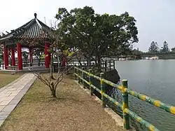 The park features the Tiger Moon Suspension Bridge (Chinese: 虎月吊橋) and a pavilion at the center of the lake island.[2]