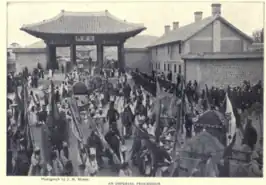 The King and Crown Prince were each carried in a golden throne by around fifty men.[7] Yun Chi-ho, a notable politician at the time, wrote a more skeptical account of the ceremony in the monthly English-language magazine The Korean Repository:[7]