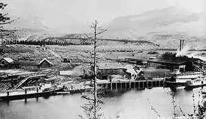 ![]() Waterfront at Golden, British Columbia. Smaller steamer on left may be Hyak. Large steamer on right is probably Duchess | |