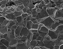 Hydrogen embrittlement as a term can be used to refer specifically to the embrittlement that occurs in steels and similar metals at relatively low hydrogen concentrations, or it can be used to encompass all embrittling effects that hydrogen has on metals. These broader embrittling effects include hydride formation, which occurs in titanium and vanadium but not in steels, and hydrogen-induced blistering, which only occurs at high hydrogen concentrations and does not require the presence of stress.[10] However, hydrogen embrittlement is almost always distinguished from high temperature hydrogen attack (HTHA), which occurs in steels at temperatures above 400 °C and involves the formation of methane pockets.[11] The mechanisms (there are many) by which hydrogen causes embrittlement in steels are not comprehensively understood and continue to be explored and studied.[1][12][13]