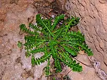 The leaves are succulent, similarly fleshy lobed to Hyoseris lucida, but it has more lobes on each leaf and they are less pointy. The flowers very similar to those of H. lucida, but larger, about the same size as those of H. radiata. Flowering stalks are greenish, unlike those of the previously two mentioned species.