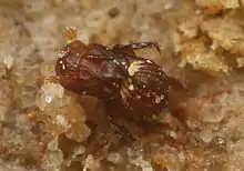 In Cambodia, a newly described species of tiny, blind, wingless scarab beetle, Termitotrox cupido, has been found inside the Hypotermes makhamensis mound, on the walls of the fungus garden chambers.[5] Other species of termites also have Termitotrox beetles dwelling in their fungus gardens but it is unclear what role these beetles play in the termite colony.[6]