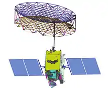 The unfurlable antenna weighing 18 kg has CFRP truss construction with aluminium alloy joints and its parabolic gold plated molybdenum mesh is supported and shaped by cable mesh structures.[4]