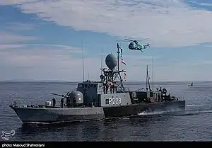 IRIS Gorz (Persian: گرز, lit. 'Mace') is a Kaman-class fast attack craft serving in the Southern Fleet of the Islamic Republic of Iran Navy. Being able to launch Mehrab (a reverse engineered version of RIM-66 Standard), she is considered the smallest warship in the world to operate such a missile. It is reportedly the only ship in her class that is capable of firing surface-to-air missiles, as of 2020.[2]