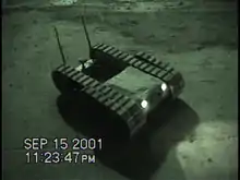 A PackBot Scout robot shown with its second pair of treads in the horizontal position. This robot is conducting search and rescue at ground zero after the 9/11 terrorist attacks.