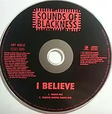 "I Believe" is a song by American vocal and instrumental ensemble Sounds of Blackness. It was produced by Jimmy Jam & Terry Lewis and was written by the duo along with: Marvin R. Pierce, Ralph Middlebrooks, Eugene Marshall Jones, Clarence Satchell, Gregory Allen Webster and Walter Junie Morrison. The song was released in 1994 as the first single from the group's third album, Africa to America; The Journey of the Drum (1994). It was the group's sixth release to make the US Billboard soul chart, peaking at #15, and their only Billboard Hot 100 release, where it went to #99.[1] "I Believe" was also the group's second number on the US Billboard dance chart, where it spent one week at the top.[2] It samples Ohio Players 1971 recording, "Pain".[3]
