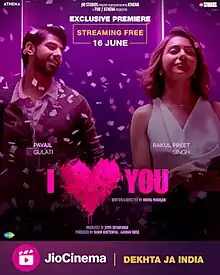 I Love You is a 2023 Indian Hindi-language romantic thriller film written and directed by Nikhil Mahajan. Produced under the banner of Jio Studios, it features Rakul Preet Singh, Akshay Oberoi and Pavail Gulati. It was released for streaming on 16 June 2023 in JioCinema.[1]