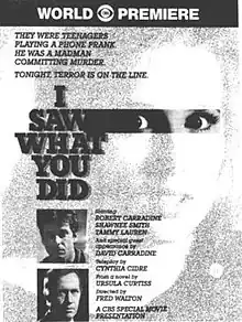 I Saw What You Did is a 1988 American made-for-television horror film directed by Fred Walton, with a screenplay by Cynthia Cidre. It is a remake of the 1965 theatrical film of the same name starring Joan Crawford, and the second adaptation of Out of the Dark by Ursula Curtiss. The film stars Shawnee Smith and Tammy Lauren as teenage friends Kim Fielding and Lisa Harris, respectively, and Candace Cameron as Kim's younger sister Julie; opposite them is Robert Carradine as the mentally disturbed Adrian Lancer, and David Carradine as his brother Stephen. While making prank phone calls pretending to know who the other person is, and what they've done, Kim and Lisa call Adrian, who has recently murdered his girlfriend, causing him to set out to find them.
