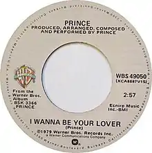 "I Wanna Be Your Lover" is a song by American recording artist Prince. It was released on August 24, 1979, as the lead single from his second album, Prince.[6] The song was Prince's first major hit single in the United States, reaching number 11 on the Billboard Hot 100 on January 26, 1980, holding the number 11 position for two weeks, and peaking at number one on the Billboard Hot Soul Singles chart for two weeks.[7]