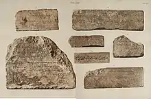The Idalion Temple inscriptions are six Phoenician inscriptions found by Robert Hamilton Lang in his excavations at the Temple of Idalium (modern Dali, Cyprus) in 1869,[1] whose work there had been inspired by the discovery of the Idalion Tablet in 1850.[2][3] The most famous of these inscriptions is known as the Idalion bilingual. The Phoenician inscriptions are known as KAI 38-40 and CIS I 89-94.