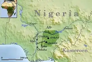 Idoma (/iːˈdoʊmə/) is the second official language spoken in Benue State in southeast-central Nigeria, by approximately one million people (2020 estimate).[1] The Idoma language is made up of the dialects of Agatu, Edumoga, Otukpo, Otukpa, Orokam, Akpa Agila, Utonkon, Igede, Etilo, Iyala. The Idoma people are predominantly hunters, farmers and fishermen. They are bordered to the north by Nasarawa, south by cross river, east by Taraba and west by Enugu and Kogi States.[1]