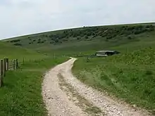 The Downs to the west of Iford are impressive. It is the most treeless part of our Downs without the deep-cut bostals (tracks) visible in other parts, as medieval traders and herders descended these slopes comparatively rarely. At the top of the scarp in this area are three hills: Front Hill, Iford Hill and Swanborough Hill. Across the ridge is the line of the South Downs Way.Unfortunately despite passing close to the designated Iford Hill slopes, it does not actually pass ancient Downland pasture, nor benefit from the flowers and wildlife that survives off it. Three ancient barrow clusters have also been lost to the plough on Front Hill.[9]