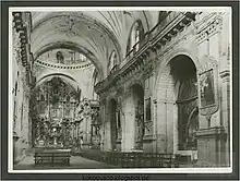 The interior also hosts two paintings of great historical value. The first, located on the northern wall, is The Wedding of Martín García Oñas de Loyola with Doña Ñusta Beatriz Clara Qoya, which depicts the union of this Spanish captain, nephew of St. Ignatius of Loyola (who is founder of the Society of Jesus) and apprehender of the last Incas of Túpac Amaru, and the ñusta of Inca lineage, daughter of Sayri Túpac and therefore niece of Túpac Amaru. This noble indigenous woman, Beatriz Clara, was heiress of the Lordship of Yucay. Their mestiza daughter, ñusta Lorenza de Loyola Qoya, was the first Marquiss of Santiago de Oropesa, the nobiliary title that granted claim to all the properties of the Yucay Valley and the surrounding Oropesa, with the power to rule them with complete independence of the local authorities.[8] This daughter married Juan de Borja y Enríquez de Luna, son of St. Francis Borgia. Also on the canvas are Túpac Amaru and Sayri Túpac, who, like the princess, wear native clothes; behind them appears the achiwa, a kind of umbrella made of multicolored bird feathers and used only by the Inca. The second painting is on the south wall and represents the wedding of Beltrán García de Loyola with Teresa Idiáquez, daughter of Juan Idiáquez and Magdalena de Loyola.[9]