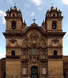 The Iglesia de la Compañía de Jesús (Church of the Society of Jesus) is a historic Jesuit church in Cusco, the ancient capital of the Inca Empire, in Cusco Region, Peru. It is situated in the Plaza de Armas de Cusco, the city center. It is built on an Inca palace.[1] It is one of the best examples of Spanish Baroque architecture in Peru. The architecture of this building exerted a great influence on the development of many Baroque architecture in the South Andes. Its construction began in 1576, but it was badly damaged in an earthquake in 1650. The rebuilt church was completed in 1673.