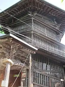 Iimori Mountain has been heavily commercialized and the site includes many souvenir shops and exhibitions.[4] The staircases from the foot of the mountain to the top are fairly steep, though there is an escalator.[4] Downhill from Iimori Mountain stands Sazae-dō (さざえ堂), an octagonal wooden pagoda built in the 18th century, which formerly sealed 33 statues of a Buddhist goddess.[4][5] The statues were removed in accordance with the Shinbutsu bunri policy during the Meiji period (1868–1912).[5] Another shrine at the site is Uga-shindō (宇賀神堂), near Sazae-dō, which was built during the late 17th century and deifies a white snake as a god of abundance and fertility.[5]