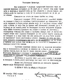 With the defeat of Yugoslavia, Trifunović-Birčanin fled to Kolašin in Montenegro before moving to the Italian-controlled city of Split in October 1941.[9] The Chetnik movement was openly and deeply hostile to the nascent Yugoslav Partisans, and this led to Chetnik commanders negotiating a series of local co-operation agreements with Italian occupying forces, based on the strong mutual wish that the Partisan insurrection be extinguished. In essence, these agreements were that Italian and Chetnik forces would leave one another alone, and in return there would be an end to persecution of Serbs by the Italians. One such Chetnik-Italian agreement was concluded at a meeting in Split on 20 October 1941 by Trifunović-Birčanin, Dobroslav Jevđević, a leading Chetnik in the inter-war kingdom, and Angelo de Matteis, head of the information division of the Italian 6th Army Corps.[10] Chetnik leader Draža Mihailović was aware of the collaborationist arrangements entered by Jevđević and Trifunović-Birčanin and condoned them.[11] In addition to Jevđević, with whom he worked closely on liaison with the Italian forces, Trifunović-Birčanin's subordinate commanders included Momčilo Đujić (northern Dalmatia), Ilija Mihić and Slavko Bjelajac (Lika), and Petar Baćović (Herzegovina and southeastern Bosnia).[9]