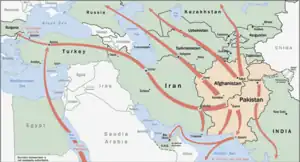 CIA map of heroin flows in Asia, 2007. The European leg, nicknamed "the Balkan route", passes through Turkey.[9]