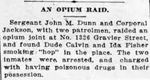In the United States, the first drug law was passed in San Francisco in 1875, banning the smoking of opium in opium dens. The reason cited was "many women and young girls, as well as young men of a respectable family, were being induced to visit the Chinese opium-smoking dens, where they were ruined morally and otherwise." This was followed by other laws throughout the country, and federal laws that barred Chinese people from trafficking in opium. Though the laws affected the use and distribution of opium by Chinese immigrants, no action was taken against the producers of such products as laudanum, a tincture of opium and alcohol, commonly taken as a panacea by white Americans. The distinction between its use by white Americans and Chinese immigrants was thus a form of racial discrimination as it was based on the form in which it was ingested: Chinese immigrants tended to smoke it, while it was often included in various kinds of generally liquid medicines often (but not exclusively) used by Americans of European descent. The laws targeted opium smoking, but not other methods of ingestion.[14]