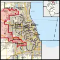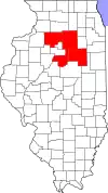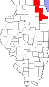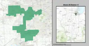 From 1865 to 1867, the district included Bureau, LaSalle, Livingston and Woodford counties.[3] From 1901 until 1947 the 11th congressional district included Kane, DuPage, McHenry and Will Counties. Following the Congressional Apportionment Act of 1947, the district covered a portion of Cook County and the far northwest side of Chicago roughly centered on Norwood Park.[4] The district was not changed by 1951's redistricting.[5] In 1961, the district was widened westward to the Des Plaines River and east into parts of Lincoln Square.[6] The district covered the northwest side of Chicago until the early 1990s when it moved closer to its current area, encompassing most of LaSalle and Grundy Counties, the southern part of Will County, the northern part of Kankakee County and a small portion of southeastern Cook County along the Indiana state line.[7] The Illinois Congressional Reapportionment Act of 2001 (10 ILCS 76) defined its boundaries following the U.S. Census 2000.