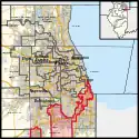 The district's population dropped by 27% in the 1950s,[9] and by 20% in both the 1970s and 1980s, due to outward migration for suburbanization and because of people leaving the area due to loss of jobs.[8][10] In redistricting after the 1990 U.S. Census, the district was extended into the suburbs for the first time in 90 years. Chicago is home to 70% of the district's residents (down from 90% in the 1990s),[11] although roughly 60% of the district's area is outside the city border. The district's white population (almost 30% of its residents) is concentrated in the suburban areas and in a few Chicago neighborhoods such as Hyde Park.[12] The district's largest white ethnic groups are Irish (7.1%), German (6.2%), Polish (4.5%) and Italian (3.2%),[13] mirroring the demographics of the neighboring third and thirteenth congressional districts. There are also sizable Dutch, Swedish, Czech, Palestinian, Greek and Lithuanian populations in the area of Oak Forest, Orland Park and Tinley Park, the district's three largest suburbs.