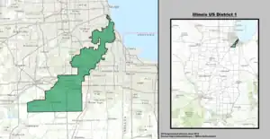 Illinois's first congressional district is a congressional district in the U.S. state of Illinois. Based in Cook County, the district includes much of the South Side of Chicago, and continues southwest to Joliet.