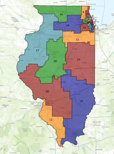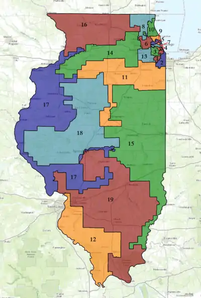 Illinois is divided into 17 congressional districts, each represented by a member of the United States House of Representatives. The majority of Illinois' districts are located in the Chicago area.