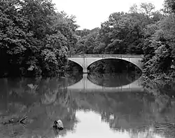 The Illinois River Bridge, also known as the Midway Bridge,[2] is a historic concrete arch bridge near Siloam Springs, Arkansas. It is located in Ozark National Forest, about 6 miles (9.7 km) east of Siloam Springs, at the end of Chambers Springs Road (which it formerly carried) south of United States Route 412. The bridge has two elliptical arch spans, each spanning 68 feet (21 m), with a total structure length of 139 feet (42 m). Built in 1922 by the Luten Bridge Company of Knoxville, Tennessee, it is one of a modest number of bridges of this once-popular and common type remaining in the state.[3]