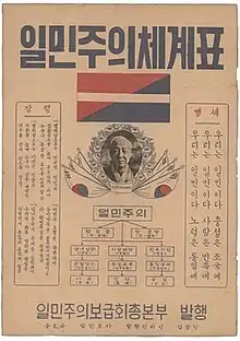 Ilminism (Korean: 일민주의; Hanja: 一民主義; RR: Ilminjuui), frequently translated as the One-People Principle,[14] One-People Doctrine,[6] or Unidemism, was the political ideology of South Korea under its first President, Syngman Rhee. The Ilminist principle has been likened by contemporary scholars to the Nazi ideal of the Herrenvolk (master race) and was part of an effort to consolidate a united and obedient citizenry around Rhee's strong central leadership through appeals to ultranationalism[6] and ethnic supremacy. In general, "Ilminists" often refers to pro-Syngman Rhee (groups).[15][16]