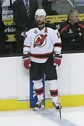In the final year of his contract, Kovalchuk and the Thrashers could not come to an agreement on an extension. Thrashers general manager Don Waddell reportedly offered 12-year, $101 million and seven-year, $70 million contracts, both of which Kovalchuk turned down.[18] A few days after Kovalchuk rejected the second contract offer, Waddell told him that he was going to be traded, rather than risk losing him to unrestricted free agency for nothing in the off-season, despite the fact that the Thrashers were still in the playoff race. On 4 February 2010, Kovalchuk was traded to the New Jersey Devils. Atlanta received defenceman Johnny Oduya, rookie forward Niclas Bergfors, junior prospect Patrice Cormier and a first-round selection in the 2010 NHL Entry Draft in exchange for Kovalchuk and defenceman Anssi Salmela; the teams also traded second-round selections in the 2010 NHL Entry Draft.[19] Kovalchuk left the Thrashers as their all-time leader in several categories, including games played, goals, assists and points. He recorded two assists the following day in his Devils' debut, a 4–3 win over the Toronto Maple Leafs on 5 February.[20] Kovalchuk eventually ended the season with 41 goals along with 44 assists, for 85 points split between Atlanta and New Jersey. On 10 February 2011, Kovalchuk scored the game-winning goal in a game over the Maple Leafs to give Jacques Lemaire the 600th win of his coaching career.[21]