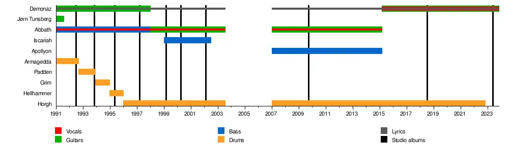 - Abbath Doom Occulta (Olve Eikemo) – vocals (1991–2015), guitars (1998–2015), bass (1991–1998), studio drums (1993–1995)