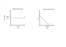 The imperfect market faces a down-ward sloping demand curve in contrast to a perfectly elastic demand curve in the perfectly competitive market.[3] This is because product differentiation and substitution occurs in the market. It is very easy for a consumer to change their seller which makes the consumer sensitive to price. The Law of demand also plays a very vital role in this market. As price increases, quantity demanded decreases for the given product. The demand curve in perfectly competitive and imperfectly competitive market has been illustrated in the image on the left.[3]