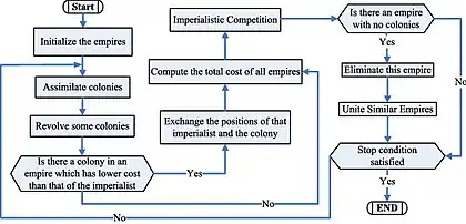 Imperialistic Competition is another part of this algorithm. All the empires try to win this game and take possession of colonies of other empires. In each step of the algorithm, based on their power, all the empires have a chance to take control of one or more of the colonies of the weakest empire.[1]
