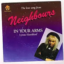 "In Your Arms (The Love Song from Neighbours)" is a song by Australian singer Lynne Hamilton. The song was used in the Australian soap opera Neighbours and it was written by the show's executive producer Don Battye and his colleague Peter Pinne. The song was released via Mushroom Records in Australia on 7" vinyl.