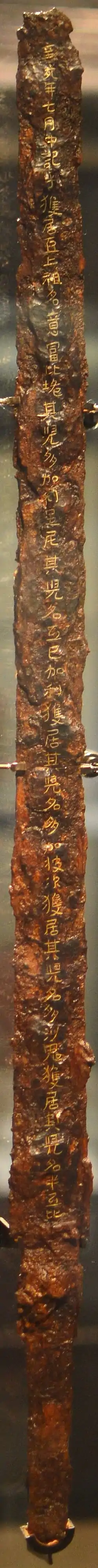 ...保管していた位置を確定でいない錆の分析の結果, 中国山東省から揚子江沿岸の江南地方の含銅磁鉄鉱を精錬して作られた地金であり, 大陸から輸入して国内で鍛冶を行い剣とされたことが推定できた。 (... The results of analyzing rust for which the storage location could not be determined showed that the metal was from Shandong Province in China, made by smelting copper-bearing magnetite from the Jiangnan region along the banks of the Yangtze River, from which it was inferred that the metal was imported from the continent and then forged into a sword in-country [in Japan].)
