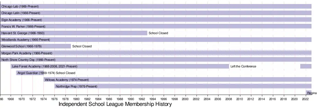 The ISL was founded in 1967.[11] The league initially comprised eight teams: Chicago Lab, Elgin Academy, Latin, Morgan Park Academy, North Shore, Francis W. Parker, and the no longer existent Glenwood School in Glenwood, Illinois (which closed its high school in 1979) and Harvard-St. George High School in the Hyde Park neighborhood of Chicago. Lake Forest Academy left the ISL in 2008 and rejoined in 2021.[12] Regina Dominican High School joined in 2022.[13]