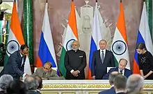 The first major political initiative, since the collapse of the Soviet Union, between India and Russia began with the Strategic Partnership signed between the two countries in 2000. President Vladimir Putin stated in an article written by him in The Hindu, "The Declaration on Strategic Partnership between India and Russia signed in October 2000 became a truly historic step".[26][27] Former Prime Minister Manmohan Singh also agreed with his counterpart by stated in speech given during President Putin's 2012 visit to India, "President Putin is a valued friend of India and the original architect of the India-Russia strategic partnership".[28] Both countries closely collaborate on matters of shared national interest these include at the UN, BRICS, G20 and SCO. Russia also supports India receiving a permanent seat on the United Nations Security Council. In addition, Russia has vocally backed India joining the NSG[29] and APEC.[30] Moreover, it has also expressed interest in joining SAARC with observer status in which India is a founding member.[6][5]