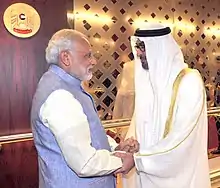 Though India and the UAE are two fast-growing economies from Asia, bilateral trade between them has not kept pace with the economic growth in the region, with trade falling to US$49.3 billion in 2016 from about US$67 billion in 2013.[15] So, during the Indian PM Narendra Modi's visit to the UAE in February 2018, both sides signed a landmark agreement to conduct trade directly in their local currencies eliminating the need for US dollars which would significantly boost trade. Both leaders have also set an ambitious target of US$100 billion in bilateral trade by the year 2020.[16][17]