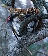 The leopard is a versatile, opportunistic hunter, and has a very broad diet.[10] It is able to take large prey due to its massive skull and powerful jaw muscles.[29][30] In Sariska Tiger Reserve, the dietary spectrum of the Indian leopard includes axis deer, sambar deer, nilgai, wild boar, common langur, Indian hare and peafowl.[31] In Periyar Tiger Reserve, primates make up a large proportion of its diet.[32]