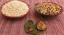 BhoonjaA snack consumed in North India, it is available in several versions under various names across the North Indian plains. Ingredients include specially roasted rice, mixtures of peanuts, various spiced pulses, seb (salty fried beans), coconut dried-ups, spices, salt, and mustard.