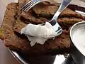 A combination of chana masala (spicy chick peas) and fried bread called bhatura (made of maida flour),[8] different varieties of bhature are available, such as aloo bhatura (filled with boiled potato) and paneer bhatura (filled with paneer). Pictured at top is chana masala, and bhatoora is below.