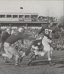 Bo McMillin is the only person to coach Indiana to an outright Big Ten Championship.[3] In 1945, the Hoosiers achieved their only unbeaten season (9-0-1).[3] The achievement earned Coach McMillan the title of Man of the Year (by the Football Writers Association) and Coach of the Year (by the Football Coaches Association).[11] Part of the team's success in this period is attributable to George Taliaferro, an African-American who helped break down color barriers in sports and played for the Hoosiers two years before Jackie Robinson suited up for the Brooklyn Dodgers.[12] A three-time All-American, Taliaferro led the Hoosiers in rushing twice, punting in 1945 and passing in 1948.[12] He helped lead the 1945 undefeated team.[12] Under Coach McMillin, IU had 10 winning seasons, including a stretch of six consecutive years.[11] His Big Ten record of 34–34–6 is the best of any Indiana coach, as is his overall winning percentage (.562).[3] His overall record at IU is 63–48–11.[11] On September 23, 1946, McMillin was named Indiana's athletic director.[13] Clyde Smith left Wisconsin La-Crosse and came to the Hoosiers as head football coach following McMillin's retirement.[3] The Hoosiers struggled mightily under Smith, as they failed to win more than three games in a single season with Smith at the helm.[14] Smith's final record at IU is 8–27–1.[14] Bernie Crimmins came to Indiana from his post as an assistant under legendary coach Frank Leahy at Notre Dame and brought along high hopes that IU football prominence would be restored.[3] However, it didn't happen. Like his predecessor, Crimmins failed to win more than three games in a single season, with yearly records of 2–7, 2–7, 3–6, 3–6 and 3–6 for a final record of 13–32 in five seasons.[3][15] Crimmins was fired as head coach and returned to Notre Dame as an assistant.[16] Bob Hicks came to Indiana from his post as an assistant at Wyoming.[3] He took over the Hoosiers football program for one season while Phil Dickens was being investigated for alleged NCAA violations.[3] He went 1–8 in his only season as head coach, failing to win a single Big Ten game.[3][17] He returned to his post as assistant coach for the Hoosiers after Dickens was reinstated.[3]